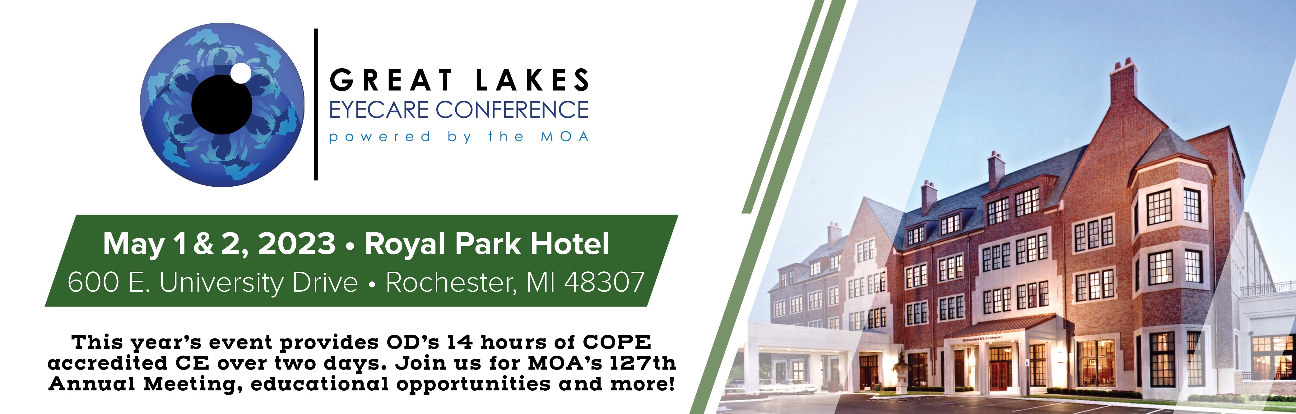 The Michigan Optometric Association is proud to host the Great Lakes Eyecare Conference. Join us at this educational meeting and trade show May 1 and 2 at the Royal Park Hotel in Rochester, MI. This event will offer up to 14 hours of education over 2-days with topics including Myopia Control, New Approaches to Subjective Refraction, Glaucoma Patient Management, Ocular Emergencies & Legal Considerations, Prevention of Medical Errors, Oral Pharmaceuticals in Eyecare, and Treatment & Management of Anterior Segment.