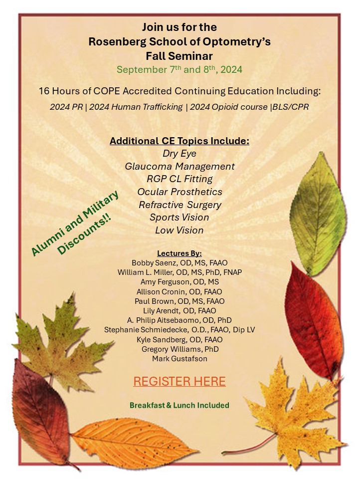 The RSO Fall Seminar will provide 16 hours of continuing education, including the 1-hour Texas Professional Responsibility Course, the 1-hour Human Trafficking Course, the 1-hour CPR Course and the 1-hour Opioid Course. Please join us September 7-8, 2024 at the University of the Incarnate Word Rosenberg School of Optometry for this in-person CE Event.